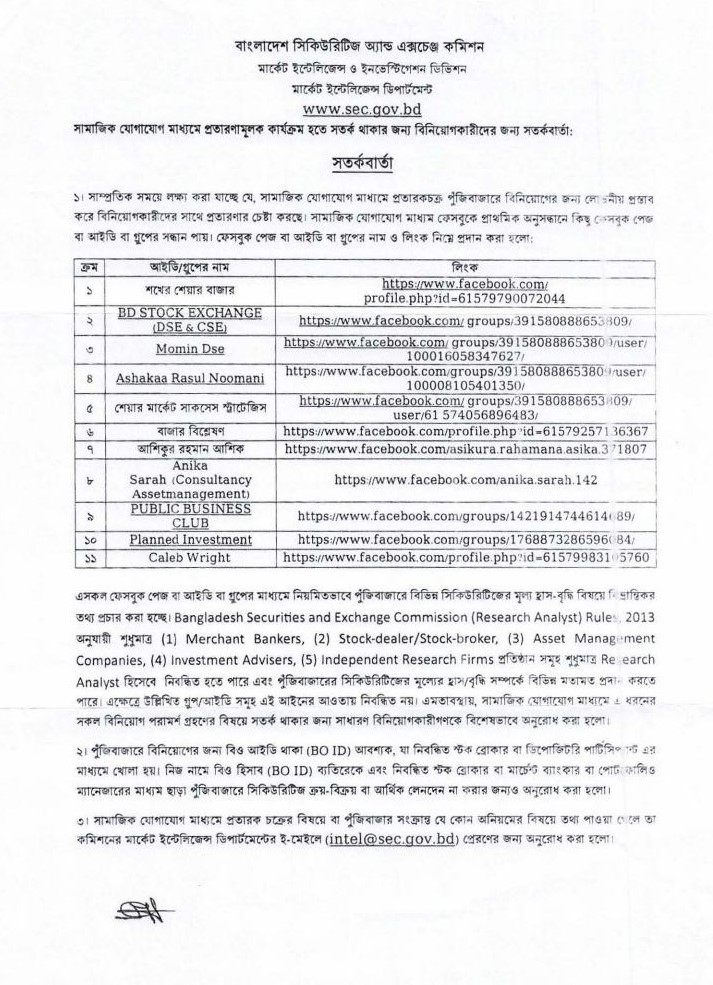 সাম্প্রতিক সময়ে লক্ষ্য করা যাচ্ছে যে, সামাজিক যোগাযোগ মাধ্যমে প্রতারকচক্র বিনিয়োগকারীদের নানা প্রলোভন দেখিয়ে টাকা হাতিয়ে নিচ্ছে। বাংলাদেশ সিকিউরিটিজ অ্যান্ড এক্সচেঞ্জ কমিশনের অনুমোদন ব্যতীত কোন ব্যক্তি/প্রতিষ্ঠান উক্ত কার্যক্রম পরিচালনা করতে পারে না। কমিশনের অনুমোদন ব্যতীত কোন ব্যক্তি/প্রতিষ্ঠান বিনিয়োগ সম্পর্কিত পরামর্শ প্রদান করলে তা শাস্তিযোগ্য অপরাধ। তাই বিনিয়োগকারীদের সতর্ক থাকার জন্য বিশেষভাবে অনুরোধ করা হলো।